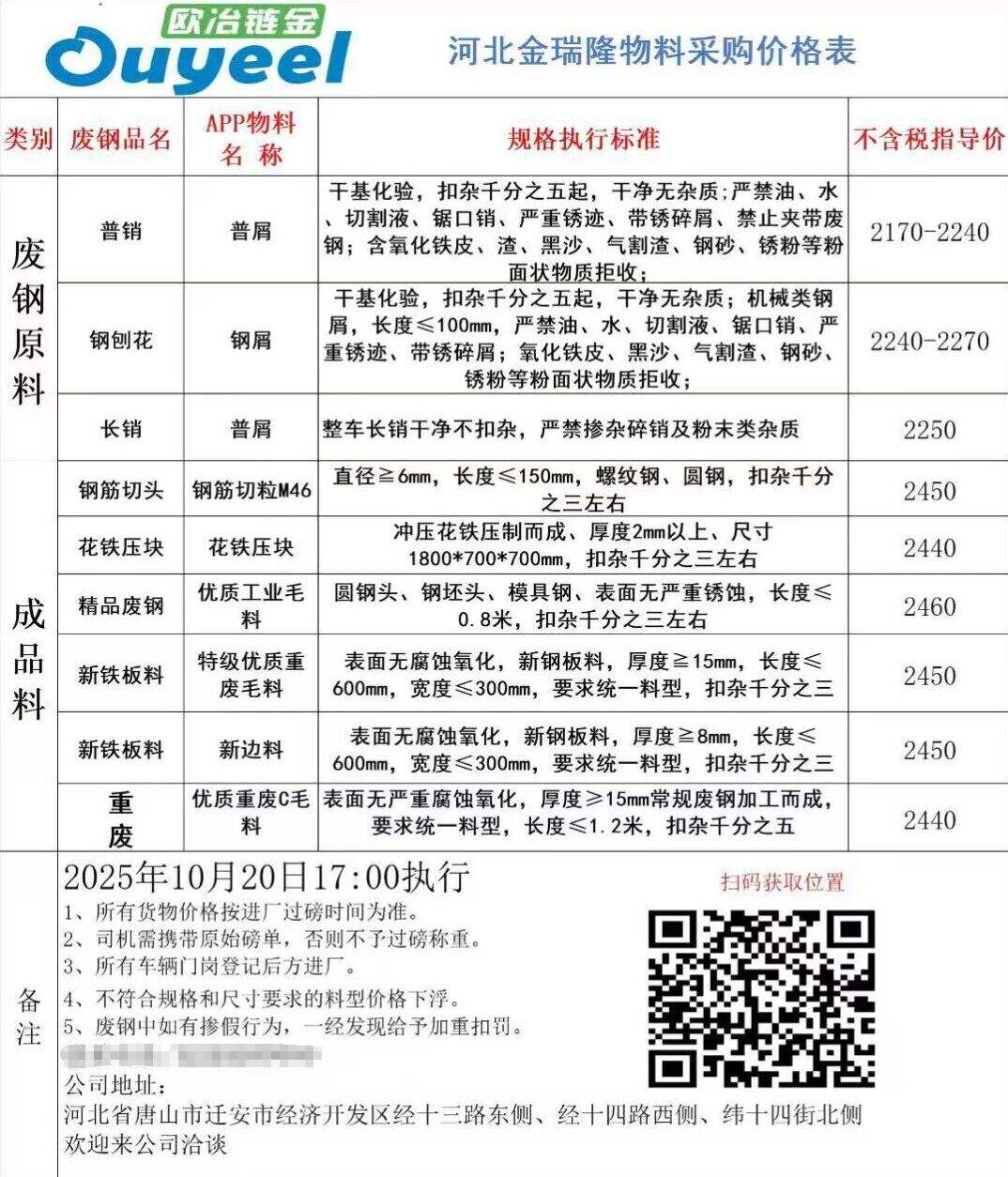 2025年10月20日下午河北金瑞隆物料采購價格表
