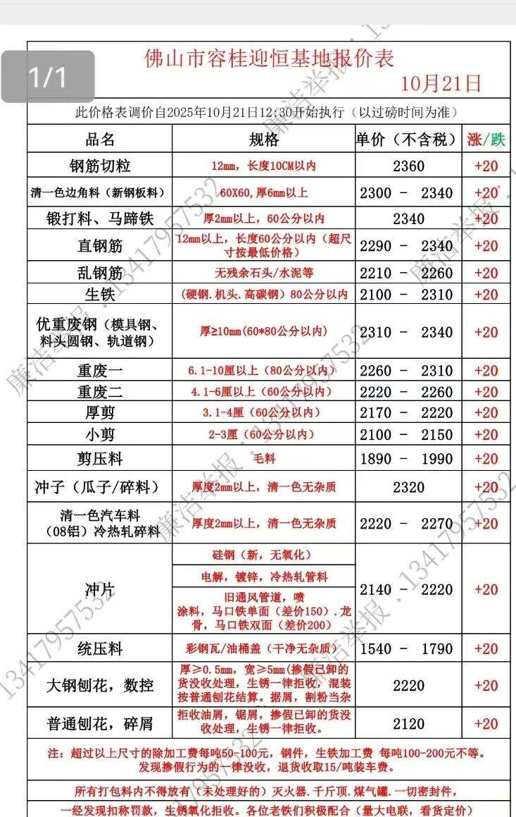 2025年10月21日佛山市容桂迎恒基地報價表