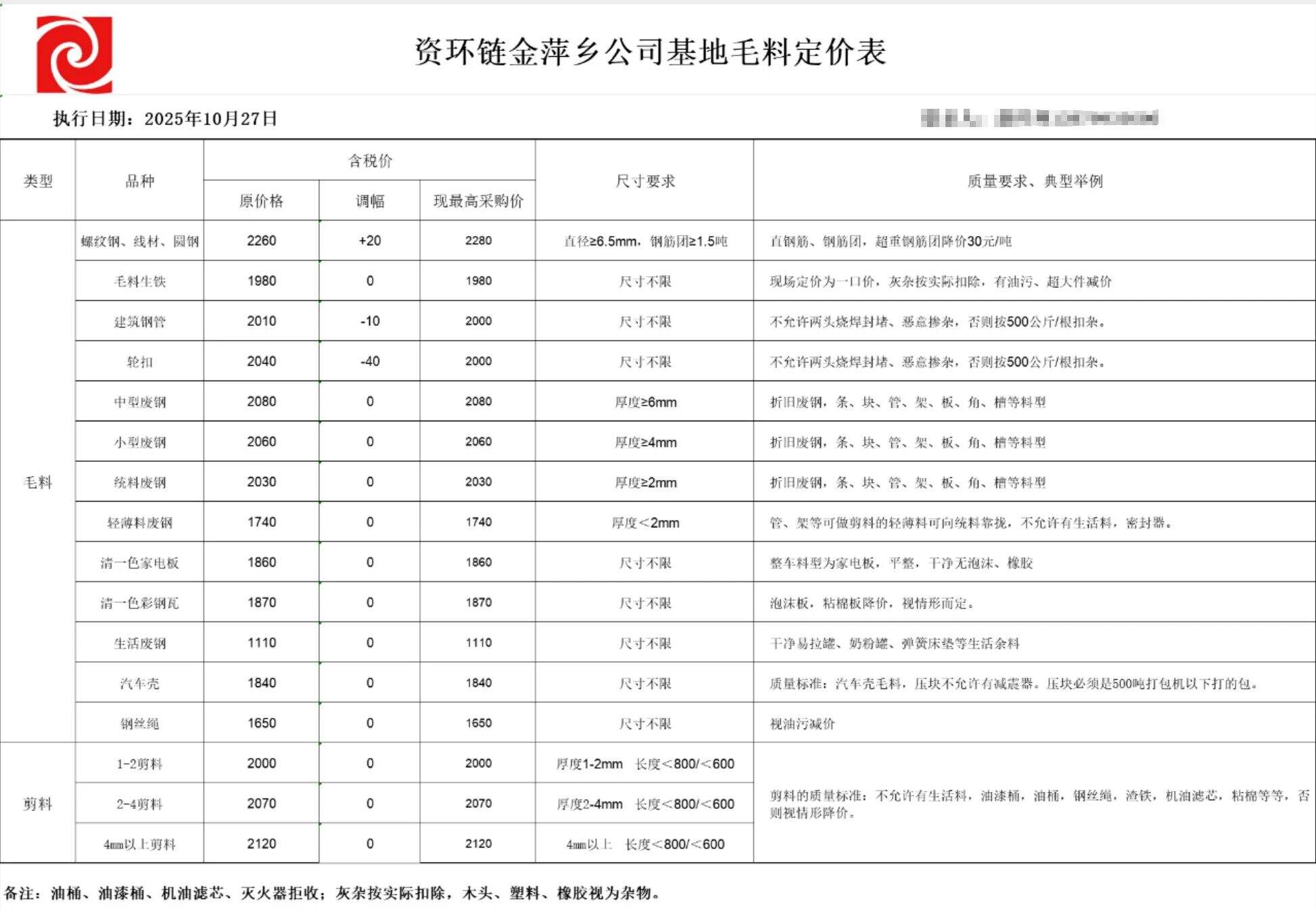 2025年10月27日資環(huán)鏈金萍鄉(xiāng)公司中心加工基地收貨價(jià)格