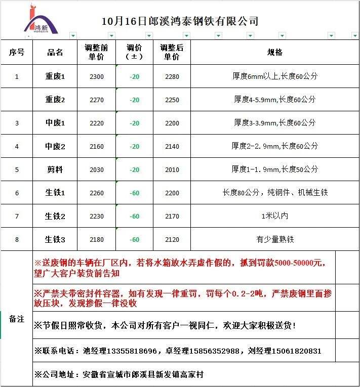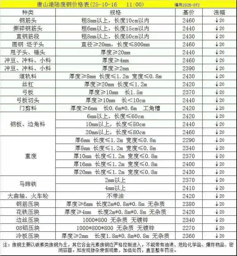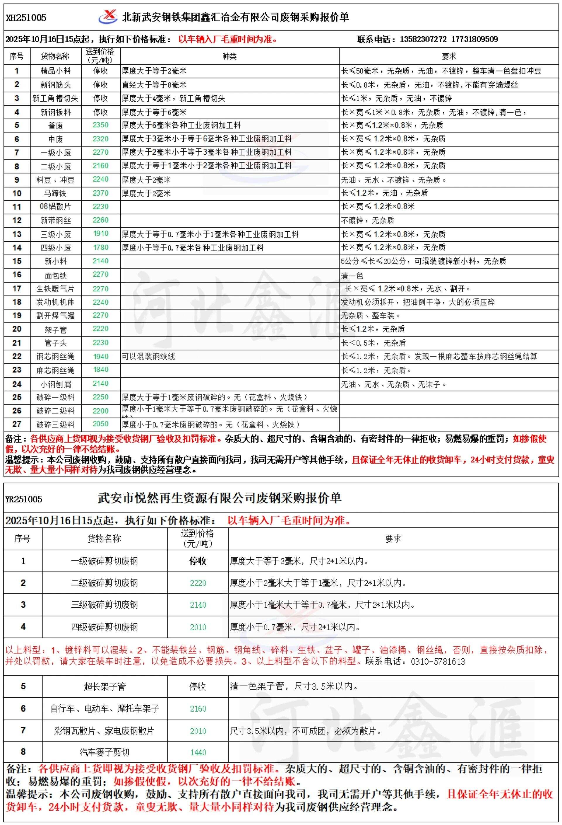 張宣科技廢鋼采購(gòu)掛牌價(jià):汽車(chē)底盤(pán)酸洗板*.*、精品打包塊*.*、**鋁散片*.*、精品打包塊*.*、小型加工廢鋼*.*、精品打包塊*.*、新鐵板料*.*價(jià)格不變;其它料型下調(diào)**元/噸。執(zhí)行時(shí)間****年**月**日**:**。詳情以?xún)r(jià)格表為準(zhǔn)。