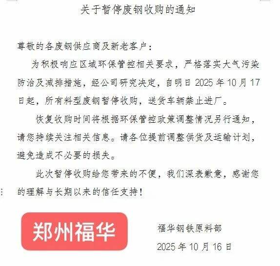 河南鄭州福華通知:明日起廢鋼暫停收購(gòu)。