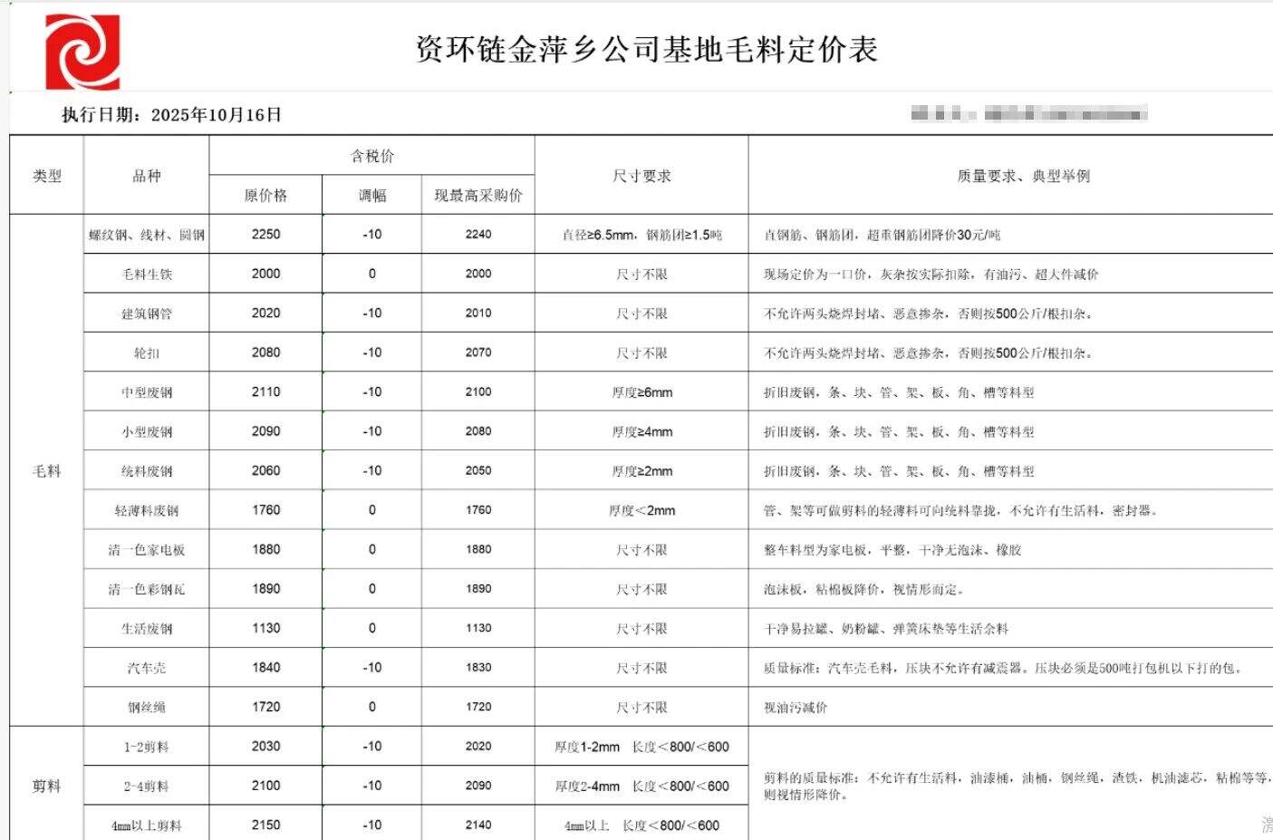 **月**日資環(huán)鏈金萍鄉(xiāng)公司中心加工基地收貨價格下調(diào):