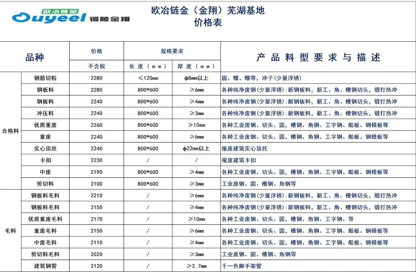 歐冶鏈金(金翔)蕪湖基地**月**日價(jià)格如下