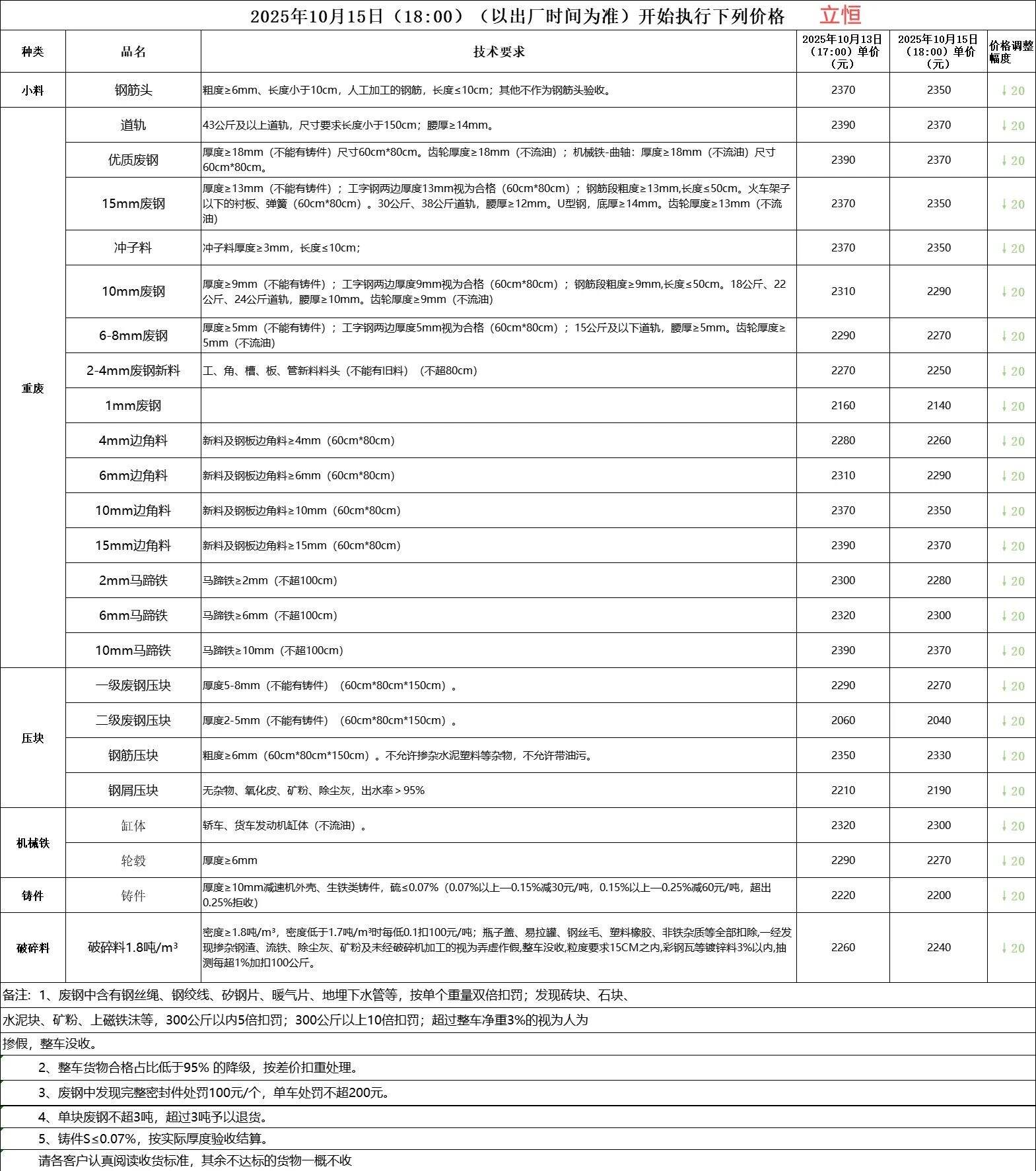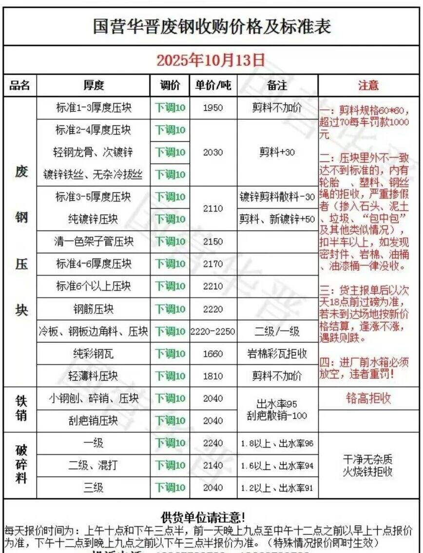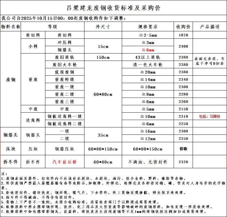 ****年**月**日*時起,呂梁建龍所有料型下調(diào)**元/噸。剪切料****,沖壓料****,鋼筋頭****,廢舊道軌****,廢舊火車輪****,優(yōu)質(zhì)廢鋼****,重廢特級****,重廢一級****,重廢二級****,重廢三級****,中廢****,鋼板邊角料一級****,鋼板邊角料二級****,一級****,二級****,鋼筋壓塊停收,汽車前后橋****