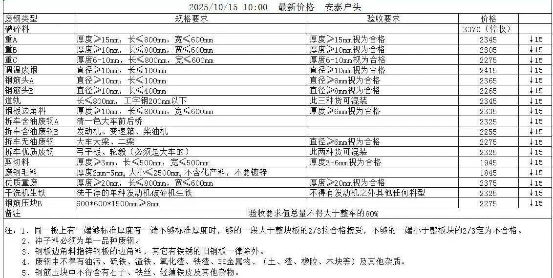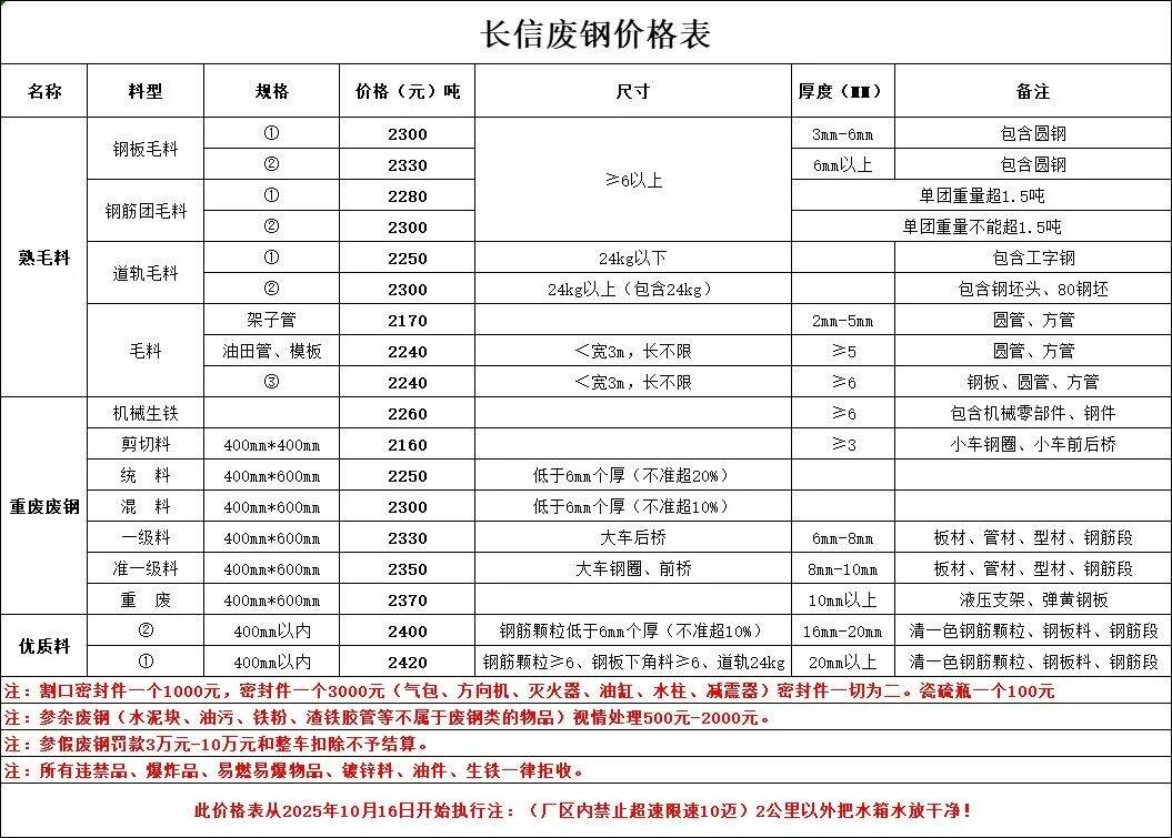 **日山西長治金燁執(zhí)行價跌**:一類鋼板料****,二類鋼板料****,一類鋼筋顆粒****,鋼筋段****,二類鋼筋顆粒****,優(yōu)質(zhì)A****,優(yōu)質(zhì)B****重廢A****,重廢B****,一類鋼筋壓塊****,二類鋼筋壓****,中廢****,普廢****,普廢壓塊****,機械生鐵****,一級剪料停收二級剪料停收彩鋼瓦停收,不含稅。