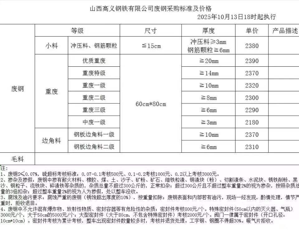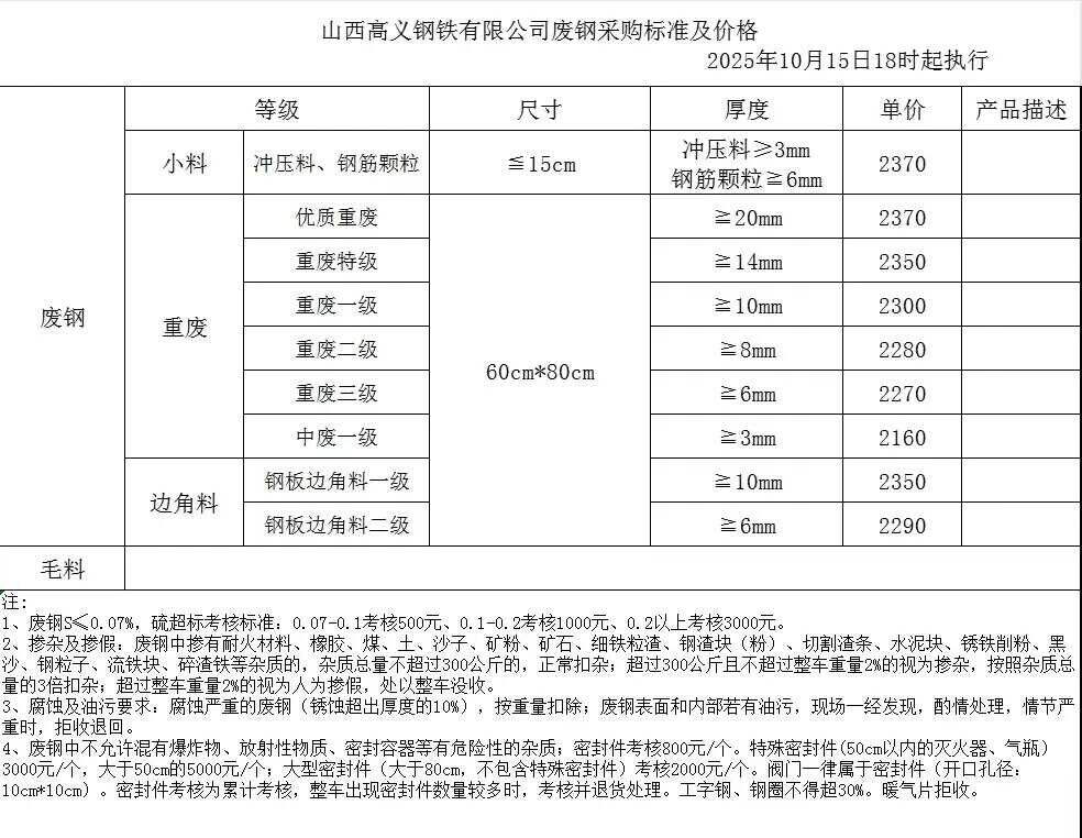 大同興華鋼鐵(原古店鋼廠)大量采購各種廢鋼不含稅接貨價**月**日*:**過磅精煉*-*mm****精煉**-**mm****精煉**-**mm****剪切料*-*mm****剪切料*-*mm****拆車件*mm****拆車件**mm****中型一類*mm****中型二類**mm****重型三類**mm****重型四類**mm****特級重料****鋼板下腳料****鋼筋頭≤***mm****鋼筋頭≤***mm****鋼筋團子****毛料一級(*-*mm)****。