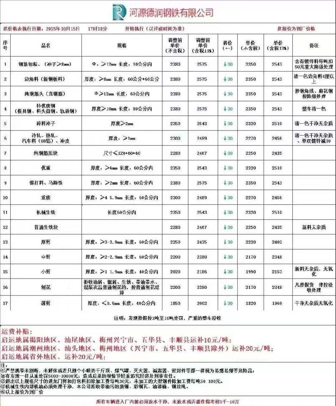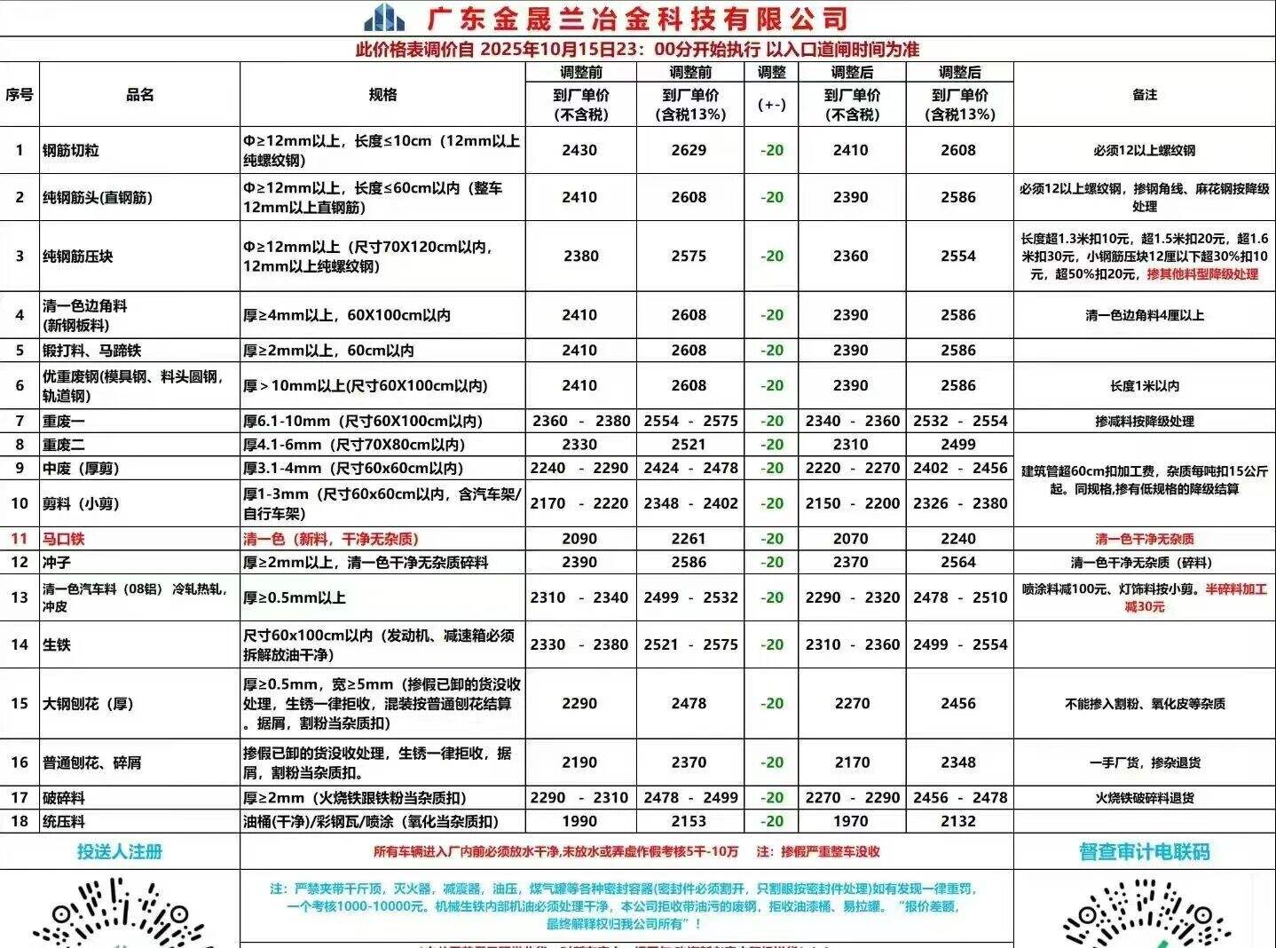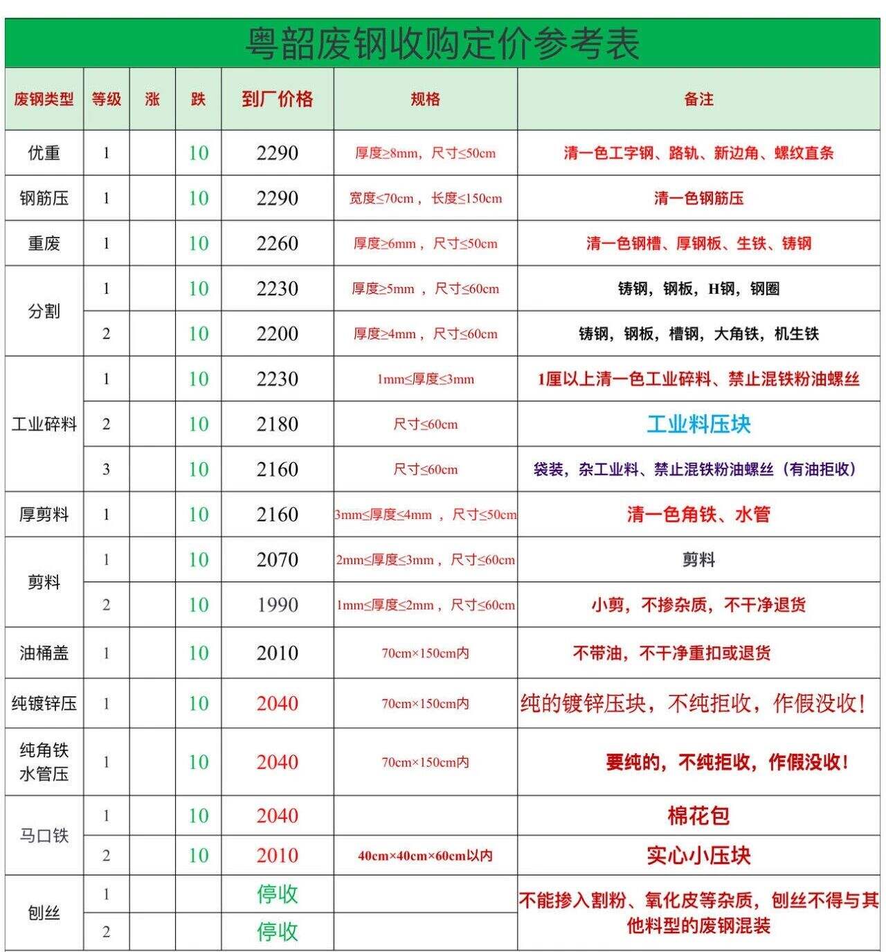 **日廣東金晟蘭廢鋼跌**執(zhí)行價(jià),鋼筋切粒****、純鋼筋頭****,鋼筋壓塊****,清一色邊角料****,鍛打料****,優(yōu)重廢鋼****,重廢一****-****,重廢二****中廢****-****剪料****-****馬口鐵****,沖子****。清一色汽車料****-****生鐵****-****,鋼刨花、數(shù)控****,普通刨花、碎屑****,破碎料****-****,統(tǒng)壓料****。不含稅。