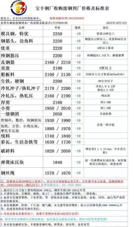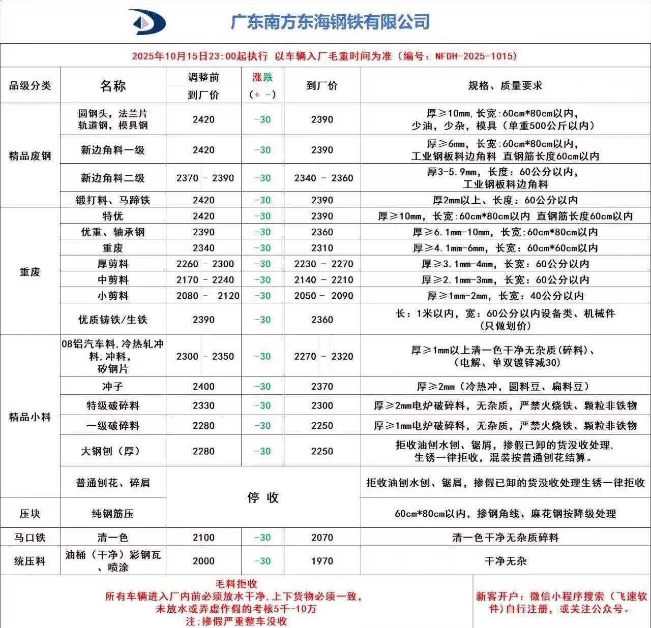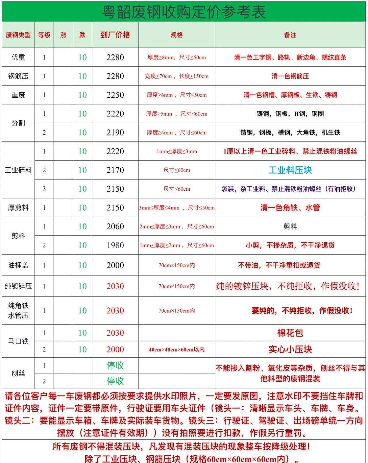 **日廣東南方東海廢鋼跌**:模具鋼****,新邊角料一級****,新邊角料二級****一****,馬蹄鐵****,特優(yōu)****,優(yōu)重****,重廢****,厚剪料****-****,中剪料****一****,小剪料****-****,優(yōu)質(zhì)鑄鐵/生鐵****,冷熱軋沖料****-****,沖子****,矽鋼片小料****-****,特級破碎料****,一級破碎料****,大鋼刨(厚)****,普通刨花、碎屑停收,純鋼筋壓停收,清一色****,彩鋼瓦****。
