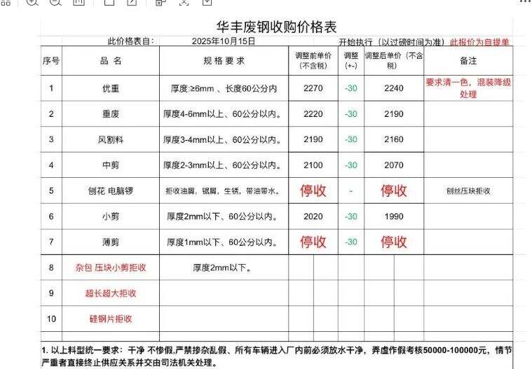 **日忠信華豐鋼鐵廢鋼跌**,優(yōu)重****,重廢****,風(fēng)割料****,中剪****,刨花停收,小剪****,薄剪停收,自提不含稅,注禁止攜帶密封等危險(xiǎn)。