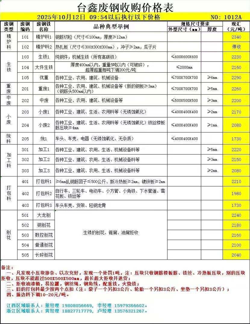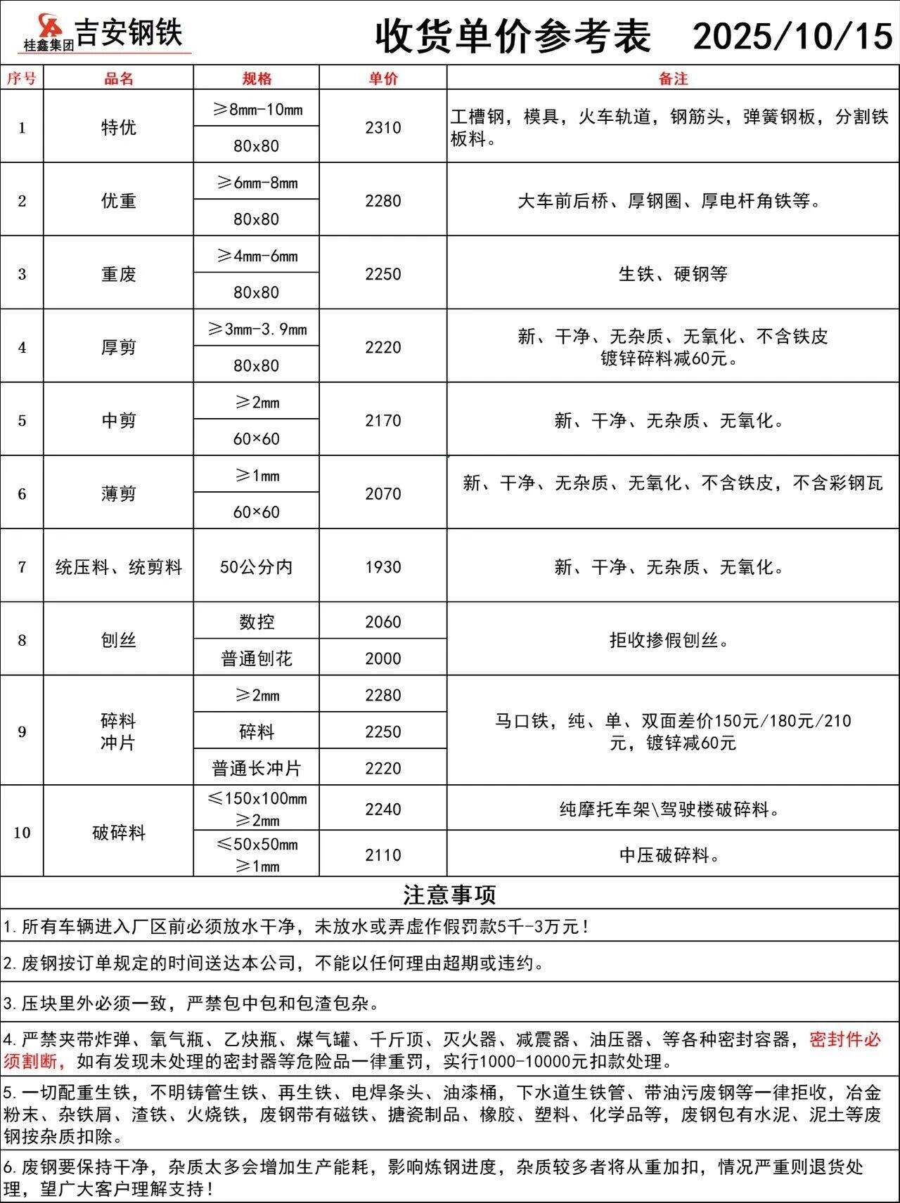 臺鑫通知:**月**日*點(diǎn)**分起,加工*上調(diào)**元,加工*及加工*上調(diào)**元,數(shù)控刨花及普通刨花上調(diào)**元,其他料型不變,生鐵一****,優(yōu)重****,重廢一****中廢****,小廢****-****,統(tǒng)料****,打包料****-****,鋼刨****,普通刨花****