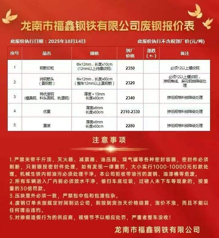 方大特鋼廢鋼自****年**月**起:,散料廢鋼下調(diào)**元/噸,鋼筋壓塊下調(diào)**元/噸,邊角料壓塊*下調(diào)**元/噸,邊角料壓塊*下調(diào)**元/噸,邊角料壓塊*下調(diào)**元/噸,A級社會壓塊下調(diào)**元/噸,普通壓塊下調(diào)**元/噸,工業(yè)壓塊下調(diào)**元/噸,B級社會壓塊下調(diào)**元/噸,打包廢鋼壓塊下調(diào)**元/噸,打包廢鋼壓塊*下調(diào)**元/噸,汽車殼壓塊下調(diào)**元/噸,汽車輪胎絲下調(diào)**元/噸,熱壓鋼塊下調(diào)**元/噸,干磨火燒鐵下調(diào)**元/噸,其他料型不變。