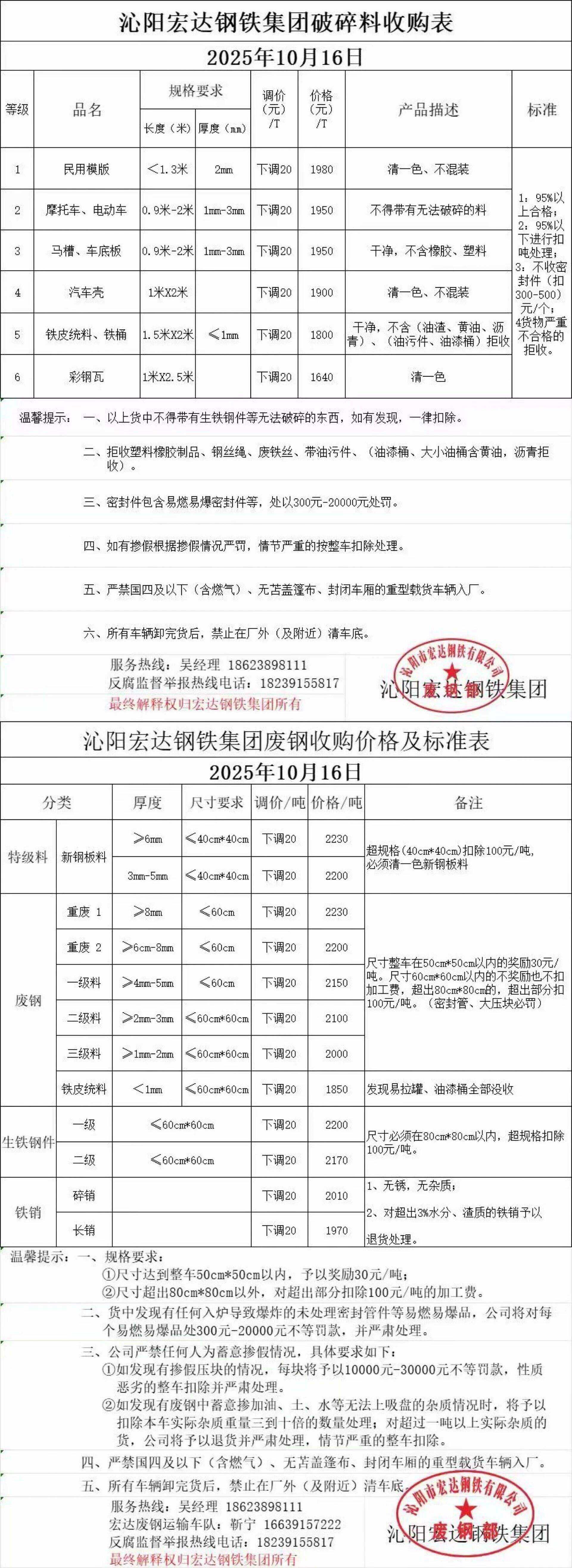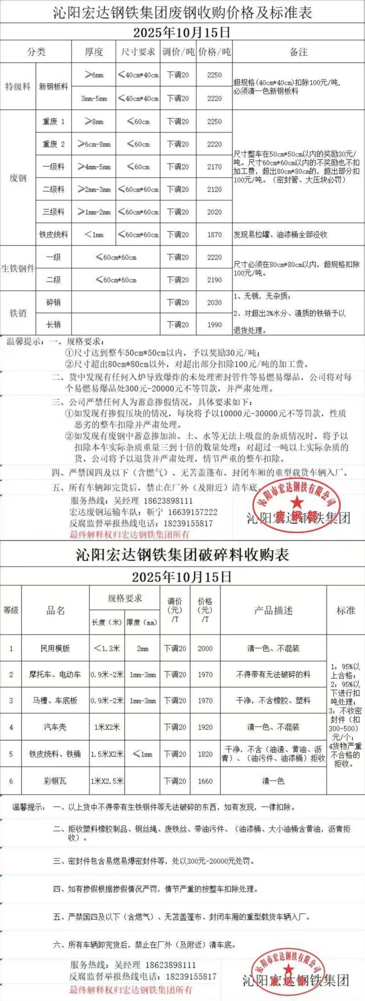 **日沁陽(yáng)宏達(dá)鋼鐵廢鋼跌**:新鋼板料****-****,重廢一****,重廢二****,一級(jí)料****,二級(jí)料****,三級(jí)料****,生鐵鋼件一級(jí)****,生鐵鋼件二級(jí)****,碎銷****,長(zhǎng)銷****,不含稅。