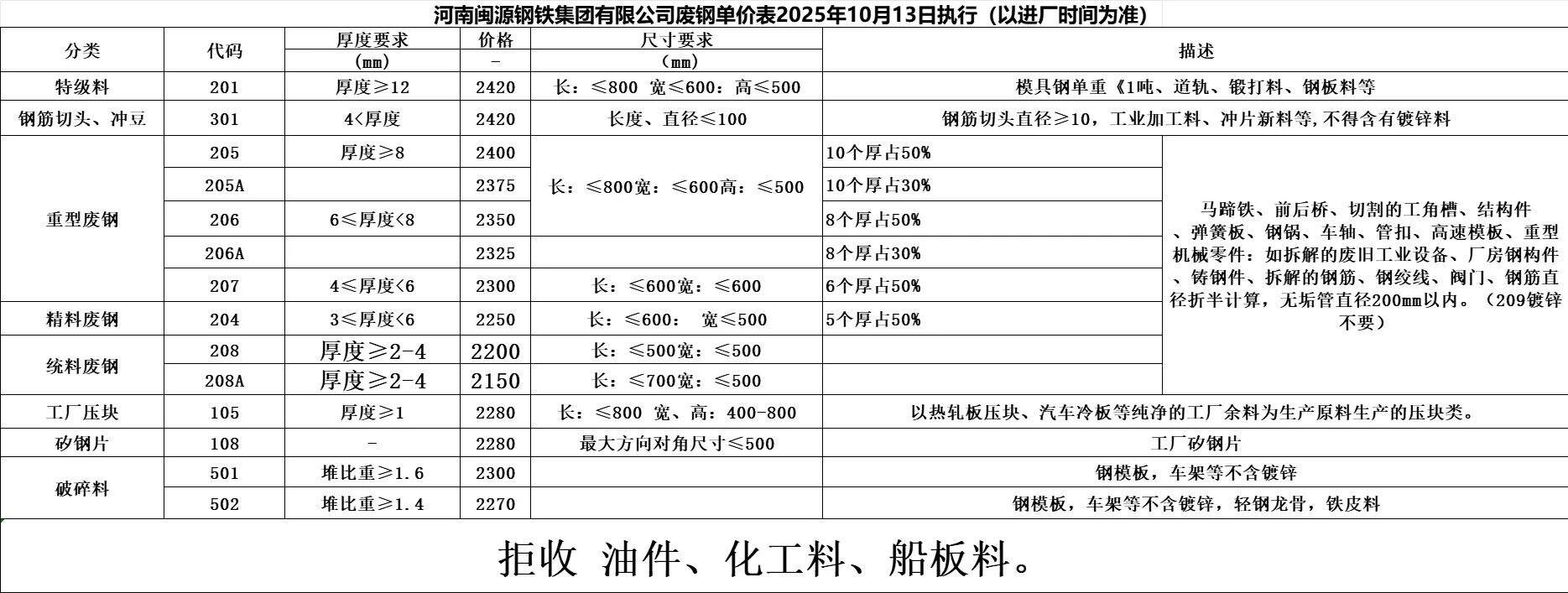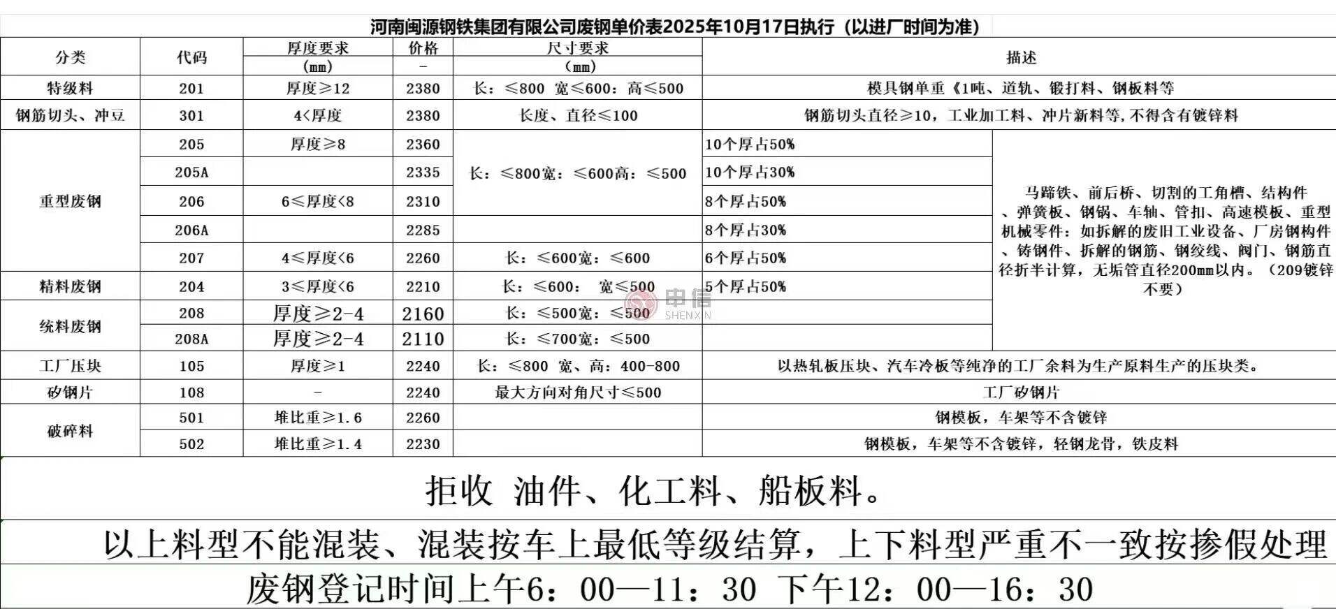**日河南閩源廢鋼跌**,特級(jí)料****鋼筋切頭、沖豆****,重型廢鋼****-****,精料廢鋼****,統(tǒng)料廢鋼****-****工廠壓塊****矽鋼片****破碎料****-****,不含稅。