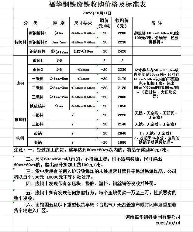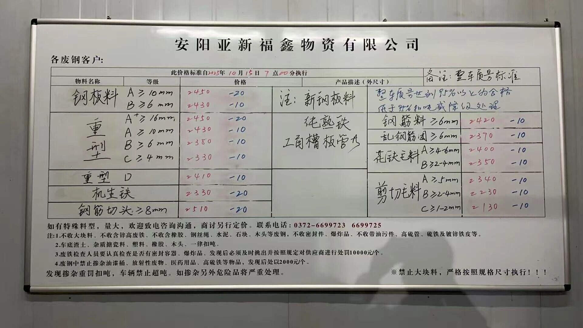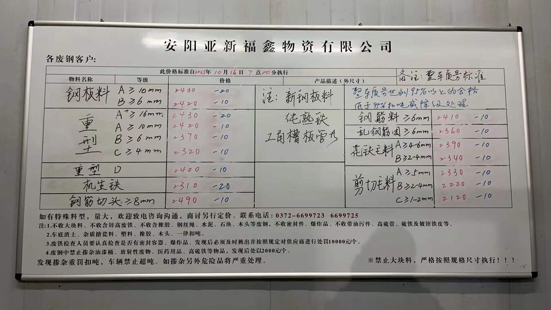 *日安陽(yáng)亞新廢鋼跌**:鋼板**厚以上****,*厚以上****,特級(jí)**厚以上****,重A**厚以上****,重B*厚以上****,重型D****,機(jī)生鐵****,鋼筋切頭****,鋼筋料****,亂鋼筋團(tuán)****,剪切毛料*厚****,剪切毛料*-*厚****,*-*厚****。(單位:元/噸)