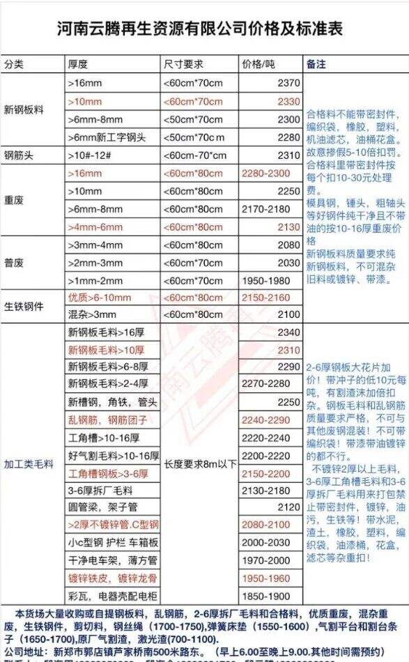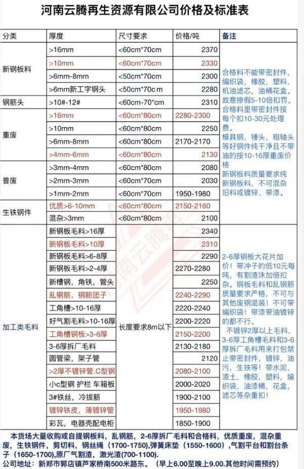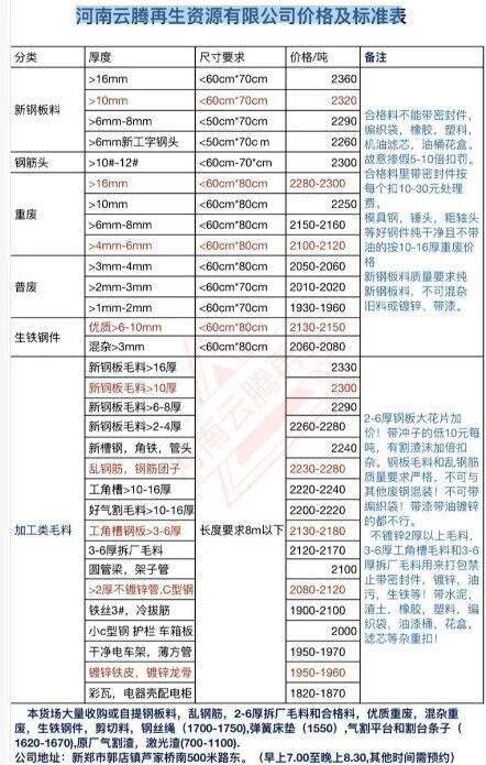 *月**日河南云騰再生資源有限公司價(jià)格及標(biāo)準(zhǔn)表