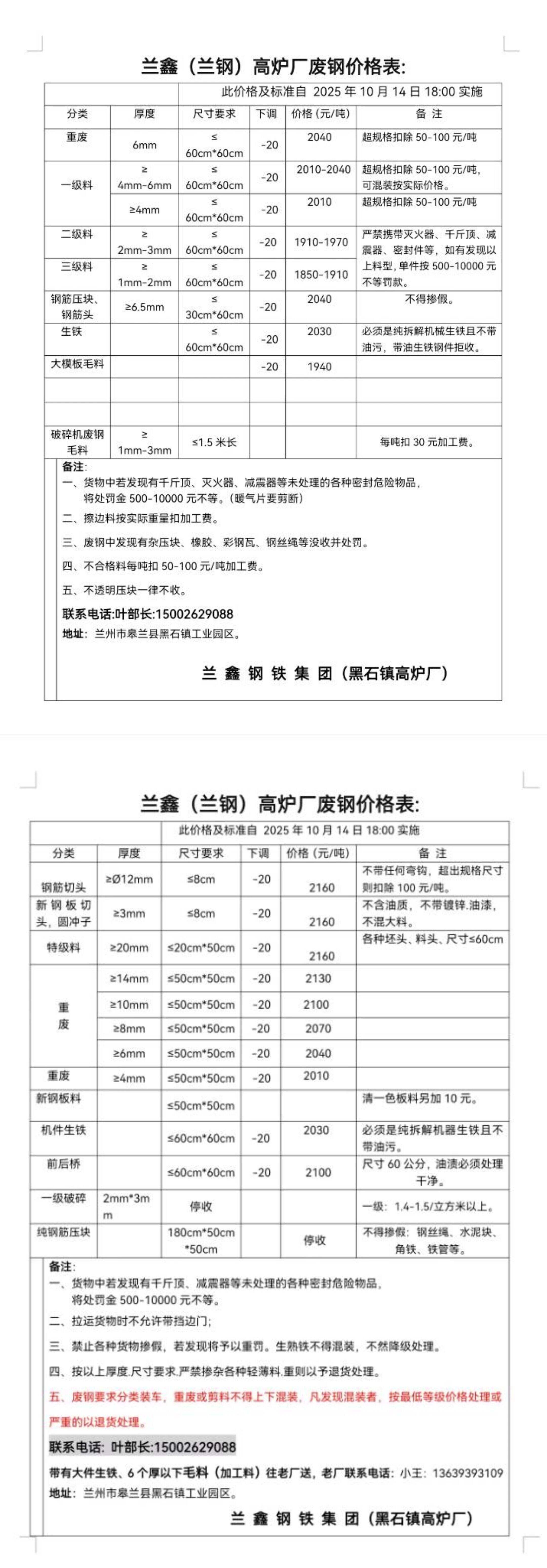 *月*日中午**點(diǎn)甘肅蘭鑫廢鋼跌**,按價(jià)格表為準(zhǔn)。