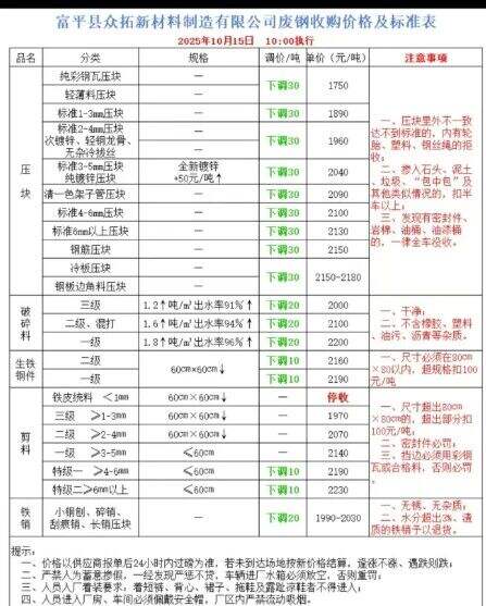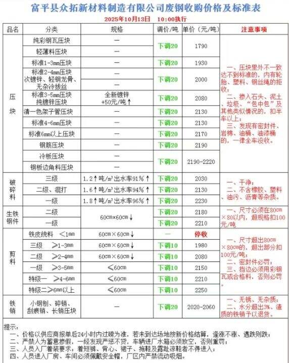 ****年**月**日陜西富平縣眾拓新材料制造有限公司廢鋼收購(gòu)價(jià)格下調(diào)**-**元